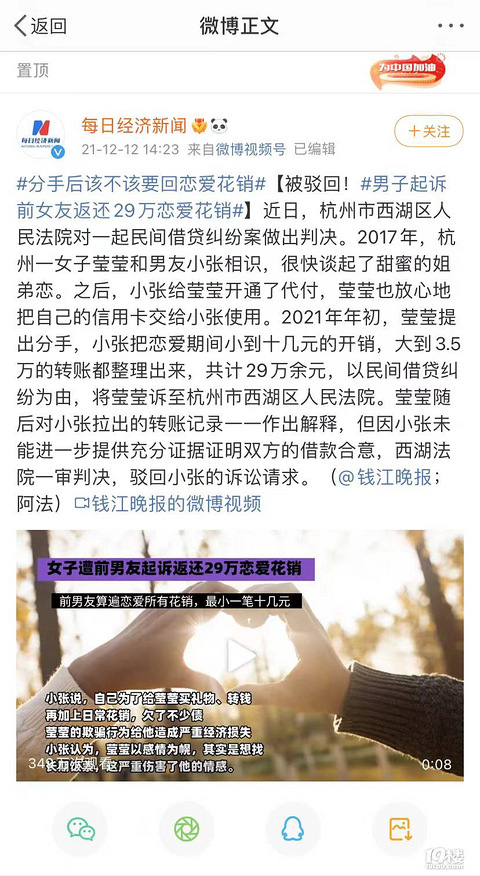 女子遭前男友起诉返还29万恋爱花销,前男友将小到十几元的开销,大到3.5万的转账都整理出来,共计29万余元,以民间借贷纠纷为由诉至法院。你觉得分手后该不该要回恋爱花销?