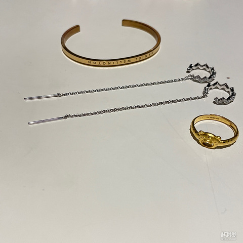 这三个是我平时戴的比较多的Dw的手镯 apm的耳环 周大福的小老虎戒指Dw的手镯在灯光下会金光闪闪 很显白 显肤色带它是不会出错的一款 也比较小众apm的耳环 是因为它有链子能挂在耳朵上 可盐可甜 银色显得精致些周大福的老虎戒指 完全是因为可爱的要命又是本命年所以毫不犹豫下单了 金色适合日常佩戴