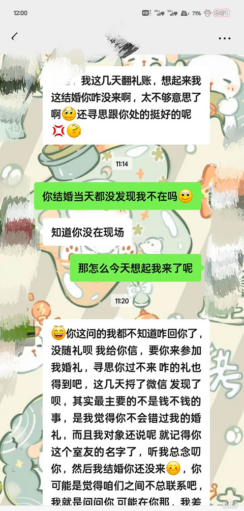大学舍友结婚,我没去参加也没随礼(这段时间手头没什么钱),结果被找上门,说了我一通还拉黑我这几年几乎没有聊天,可能一年也就过年问声新年好,关系早就淡了,今年她结婚邀请我,太远了,我就拒绝了。隔了好几天,又来联系我,说我人不来礼也该到,我真无语住了……