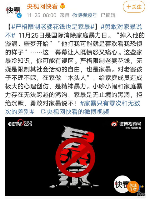 11月25日是国际消除家庭暴力日。“掉入他的漩涡、噩梦开始”“他打我可能就是喜欢看我恐惧的样子”……这一幕幕让人既愤怒又痛心。这些家暴冷知识,你可能有误区。严格限制老婆花钱,无疑是限制其社会活动的自由,也是家暴。对老婆孩子不理不睬,在家做“木头人”,给家庭成员造成极大的心理创伤,是精神暴力。小吵小闹和家庭暴力存在无法跨越的鸿沟,家暴是无止境的黑洞,拒绝沉默,勇敢对家暴说不