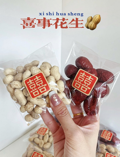 风俗里结婚需要准备一些花生、红枣这些东西, 招待宾客~以前会用洋红来染~特别麻烦,还染的手到处都是!在网上发现了这种头透明的包装袋,上面自带封条,贴上喜字~很简单!成本才1毛,好用还好看~备婚的姐妹可以参考!