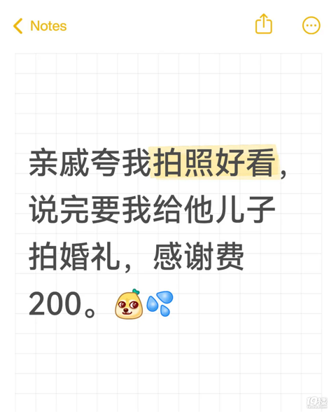 亲戚夸我拍照好看,让我给他儿子拍婚礼,感谢费200……