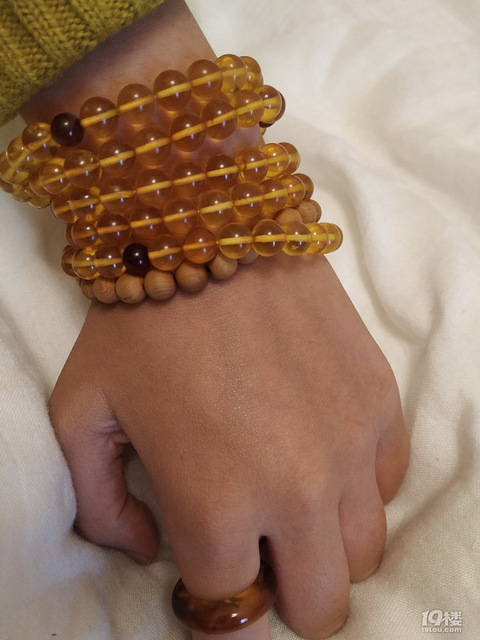 冬天,最爱琥珀,蜜蜡,木头,不会冰手腕。左手,金珀108串。崖柏单圈。 右手,金绞蜜单圈,小叶加水晶多圈,白月光手牌。手牌光超级棒的,发两张黑背景的照片为它正名。有阳光会更美。