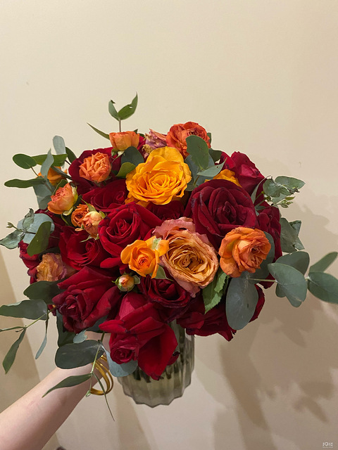 结婚还是红色比较喜庆所以接亲的时候选择了婚车搭配红色鲜花早上的手捧花也是红色的