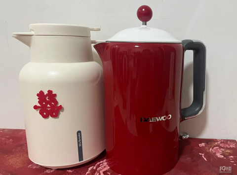 陪嫁水壶是一个烧水壶和一个保温壶,大宇烧水壶颜值超级在线,一白一红搭配起来好好看