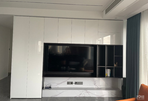 分享如下!电视背景墙主要考虑一个收纳功能,方便家里杂物所以做了柜子,简单实用边上是一个小小的展示柜,可以放书,也可以放摆件,还没买我家,后续补上下方是一个大理石材的电视柜
