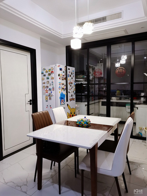 我家餐厅面积比较小,所以东西也不多。餐桌餐椅是当时做全屋定制家具的时候套餐里搭配好的,所以也没怎么花时间去选款式。白棕色搭配的桌子是可以伸缩的,把中间棕色的木板收起来就是个白色方桌了。厨房太小,所以冰箱也放在了餐厅。角落里都被我放满了置物架,绝对不能放过任何收纳空间!
