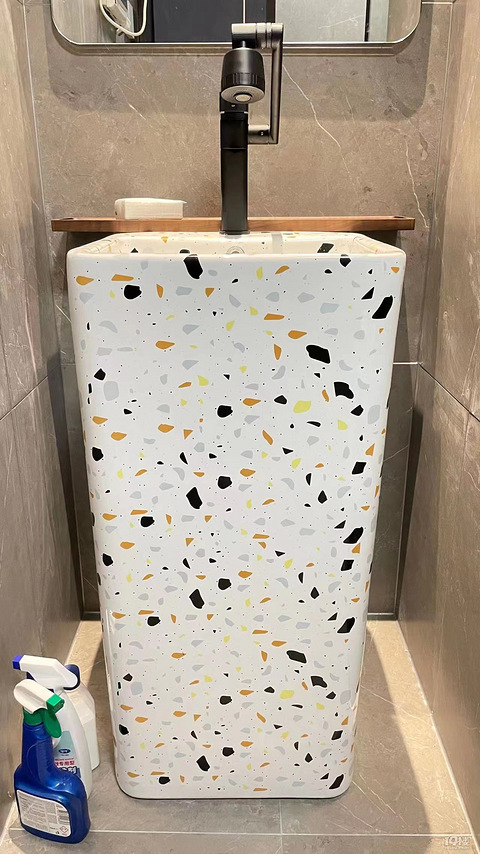 【城 市】:嘉兴【小区名称】:新中国际【面 积】:140平左右【装修费用】:35万左右【装修风格】:现代简约吧【装修时间】: 2021年 家里的角落我挺喜欢设计师的这个作品,在客卫的洗手池。水磨石材质的落地立柱柜,一体成型,高温烧制,智洁釉面,不易挂污,缤纷的花色,装扮一下客卫给人好心情,内盆深度可以,使用的时候不溅水,比较特别的是这个水龙头,万向旋转面盆龙头,可以多个角度出水,两种出水模
