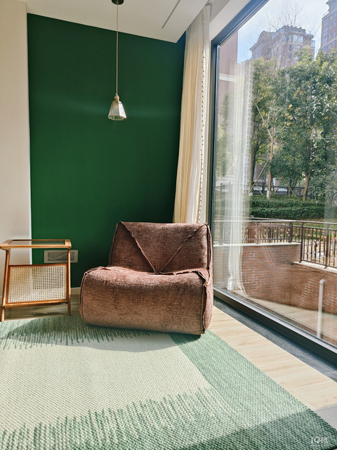 哈哈哈哈哈我实在是忍不住想来分享一下我看过在心中最具有幸福感的地方来自同事的家 在这个角落里主色调是绿色现在其实很多朋友装修时都选择最简单简约的白色其实可以根据自己的喜好在角落或者哪一个部分进行一个撞色的处理会很出效果当然会有一定的翻车几率所以靠谱的设计师很重要 当然啦一个合格的氛围感家居灯和地毯是神来一笔的作用地毯呢是选择比较粗线的效果绿色的图案和墙上的颜色有个呼应这里呢建议要买地毯的朋友常规的