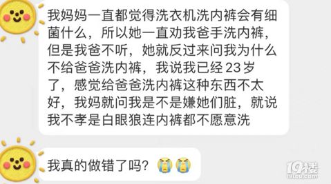 一个23岁的女孩在网上发帖,说她平时和爸爸住在一起,妈妈因为工作原因在别的地方住。 因为爸爸不喜欢洗内裤,就会直接把换下来的内裤扔进洗衣机。妈妈回家看见了说洗衣机里都是细菌,洗出来的内裤不干净,她先是劝爸爸自己手洗内裤,可是爸爸懒得洗,根本不听妈妈的。 妈妈看说不动爸爸,就转过头埋怨起女儿,怪女儿不帮爸爸洗内裤。女孩打心眼里拒绝这件事,她觉得自己已经23岁了,洗爸爸的内裤让她感觉很不好。 可妈妈却