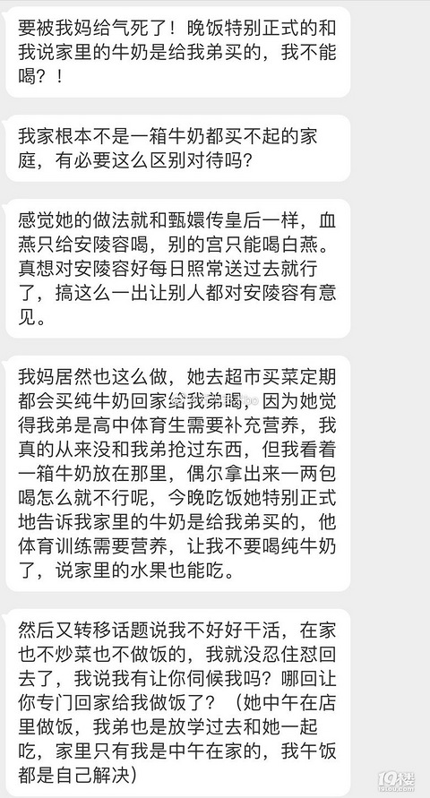 兄妹姐弟关系都是被这种父母给搞烂的......不会觉得自己儿子是太子自己就母仪天下了吧,看到个网友投稿,很气愤难理解,这种亲妈也能干出这样的事!说家里的牛奶买来就是给弟弟喝的,当姐姐的不能喝~ 我去!大清都亡了好久了,亲妈重男轻女成这样,难怪女孩心理不平衡,现在的孩子也不是好欺负的,直接上网吐槽:“亲妈罪行”,不过这样的成长环境,这个女孩以后应该摆脱不了挣钱养弟弟了