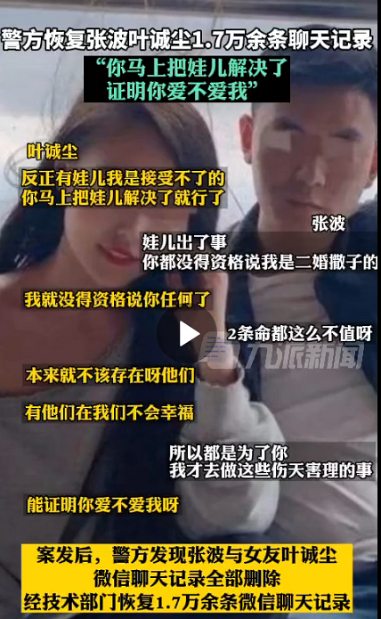 警方恢复张波叶诚尘聊天记录:你马上把娃解决了,证明你爱不爱我