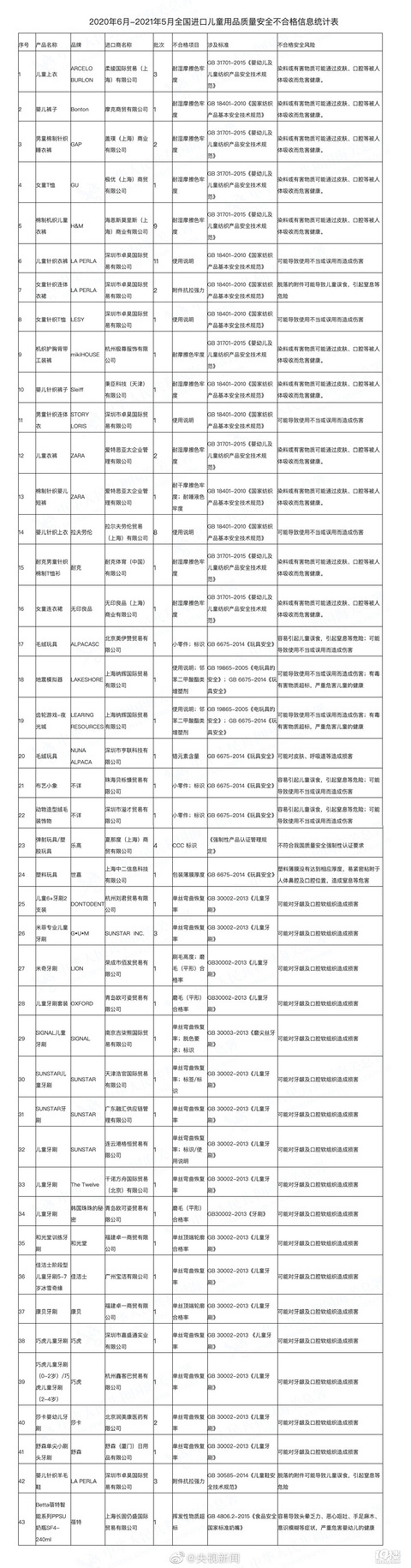 今天,海关总署通报对一年来查发的部分进口儿童产品质量情况,涉及儿童服装、玩具、牙刷、童鞋及奶嘴奶瓶等5类81批次产品。其中,耐克、HM等10种品牌的部分儿童服装耐湿摩擦色牢度不合格,可能会导致染料或有害物质或通过皮肤、口腔等被人体吸收而危害健康。