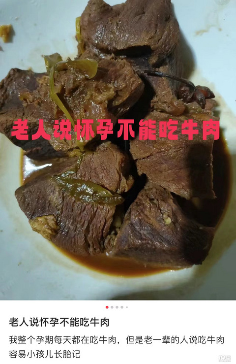 老人说怀孕不能吃牛肉,吃看容易小孩儿长胎记也是第一次看到这个谁发...你们怀孕的时候,还有什么是老一辈说的不能做的?