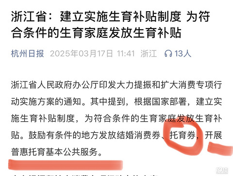 刚看的新闻,浙江省大力提振和扩大消费专项行动实施方案里面,有提到鼓励有条件的地方发放托育券,开展普惠托育。不知道嘉兴会不会发。 现在小孩的托育支出真的不少,好一点的4000+一个月,普惠的2000+一个月,一学期下来好多钱。期盼一下托育券,多少可以补贴一点,惠民惠商。