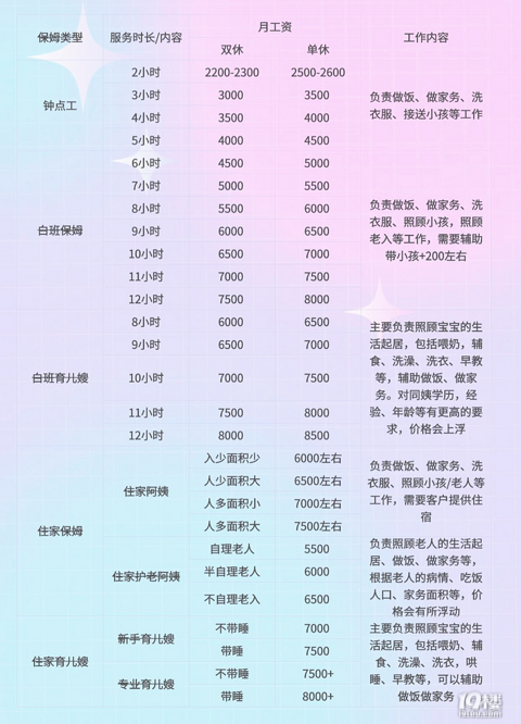 育儿嫂,保姆,钟点工阿姨的jia格表,看看你现在的阿姨都是这个价吗?